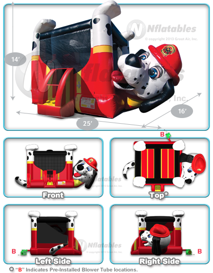 It's firehouse fun with our Fire Dog Belly Bouncer®! This moonwalk features FingerSafe™ mesh netting that won't catch small fingers, yet remains transparent enough to allow for easy supervision. This unit can also be purchased as a Bouncer & Slide Combo! If you like this unit, check out our full line of fire-fighter themed inflatables.