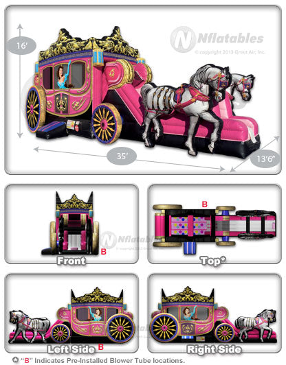 Are you ready for a princess party? We've taken our best-selling Princess Carriage Combo™ and added stunning digitally-printed inflatable horses, making this inflatable bounce house combo even more spectacular! Plus, it is wet/dry compatible - a drip hose hookup along the slide means it can be used with or without water! There are also special built-in drain holes that make draining this unit a breeze!